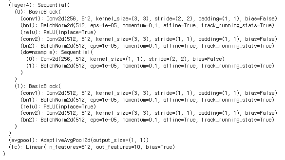 model.fc = nn.Linear(num_ftrs, 10) # fc를 nn.Linear(num_ftrs, 10)로 대체한다.